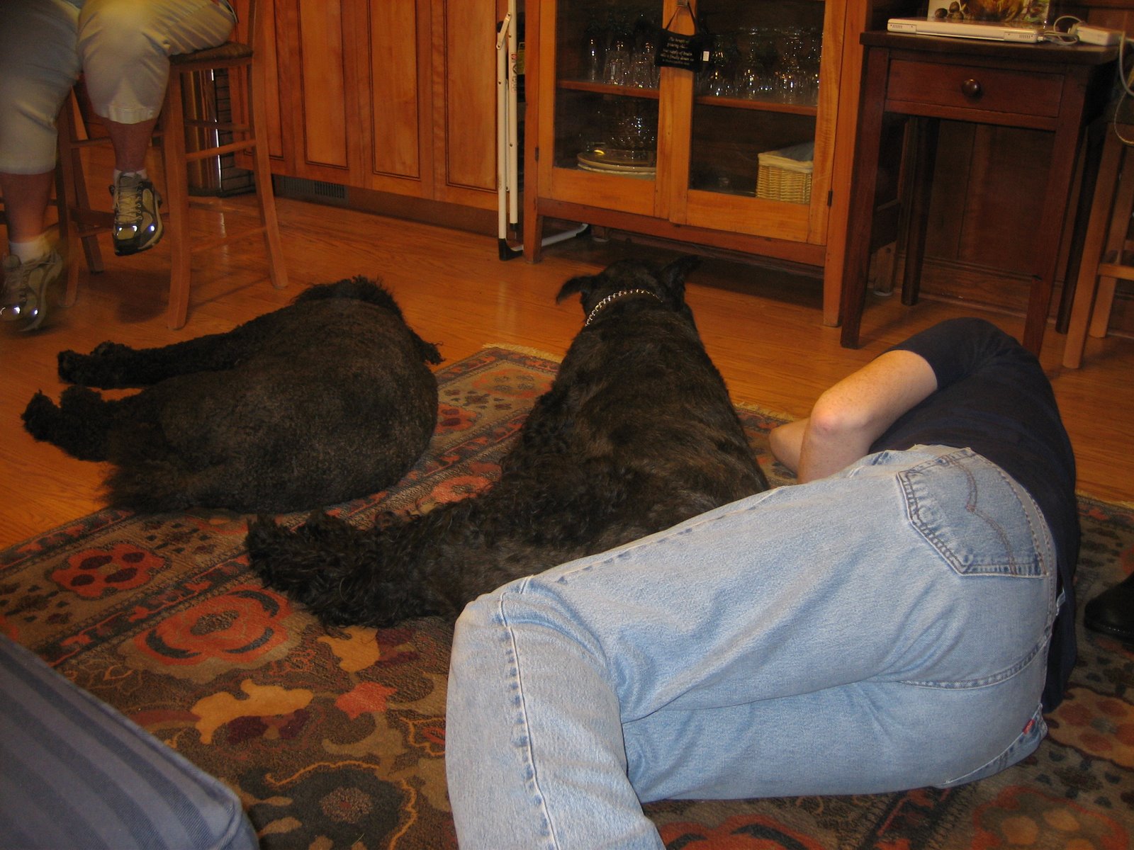 So to the left there you see two very large black dogs. Magic, the very earnest looking poodle is to the left. Cassie, the not so earnest looking but very sweet giant schnauzer is on the right. The non-canine in the center is my sister-in-law, Sandi. She’s kneeling; the dogs are sitting. The dogs are very large.