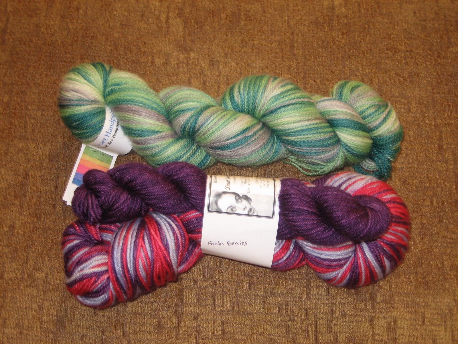 New sock yarn from The Loopy Ewe! The bottom skein is a Duet, which is a skein of yarn for the main body of the sock plus a smaller solid color skein for the toes and heels. Way kewl. And the shipping from there was lightning fast, so my desire for new stash was quickly satisfied.