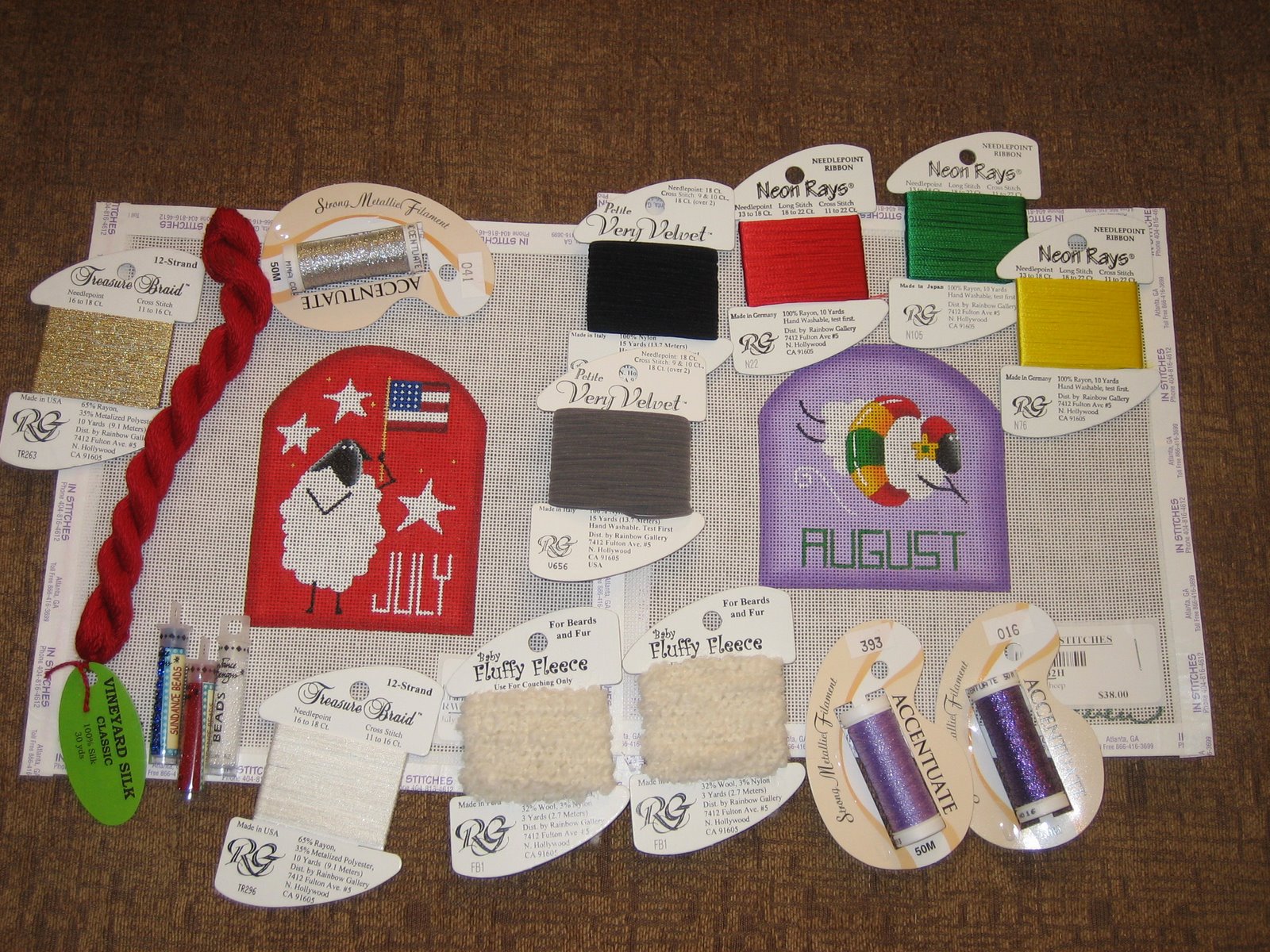 From there, my tale of woe begins. Enter my two friends Jill and Andy, who lead little ol’ naive me, innocent as a lamb, to the slaughter (Richard tagged along as pack mule because we promised him lunch). First we go to the needlepoint store in Buckhead. I was successfully resisting the urge to purchase when I hear Andy say “Sheep!”. She has found the Sheep of the Month. July and August, plus all the fibers to do them, have to come home with me immediately. I was powerless. After all, it was sheep, right?? I mean, look at them!!!!