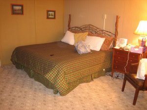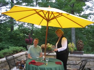 This is the seventh year in a row that we’ve visited Highlands for our anniversary (which was Aug. 11 – 23 years!). We started going there because the town featured a very pet friendly hotel. That hotel was subsequently bought by some not so pet friendly people, so we switched to the Skyline Lodge. Our room looks like this:Not on the posh side, but very comfortable. Faces the mountains and has a very nice view. Staff is very friendly and very accomodating. Best part of all is the restaurant at the hotel, which has a patio and welcomes all three of us to dine there.Here you see one of the managers welcoming Richard and Oscar to dinner. The chef will cook up a burger especially for Oscar so His Royal Lowness can dine with us. The food is fantastic too!!!