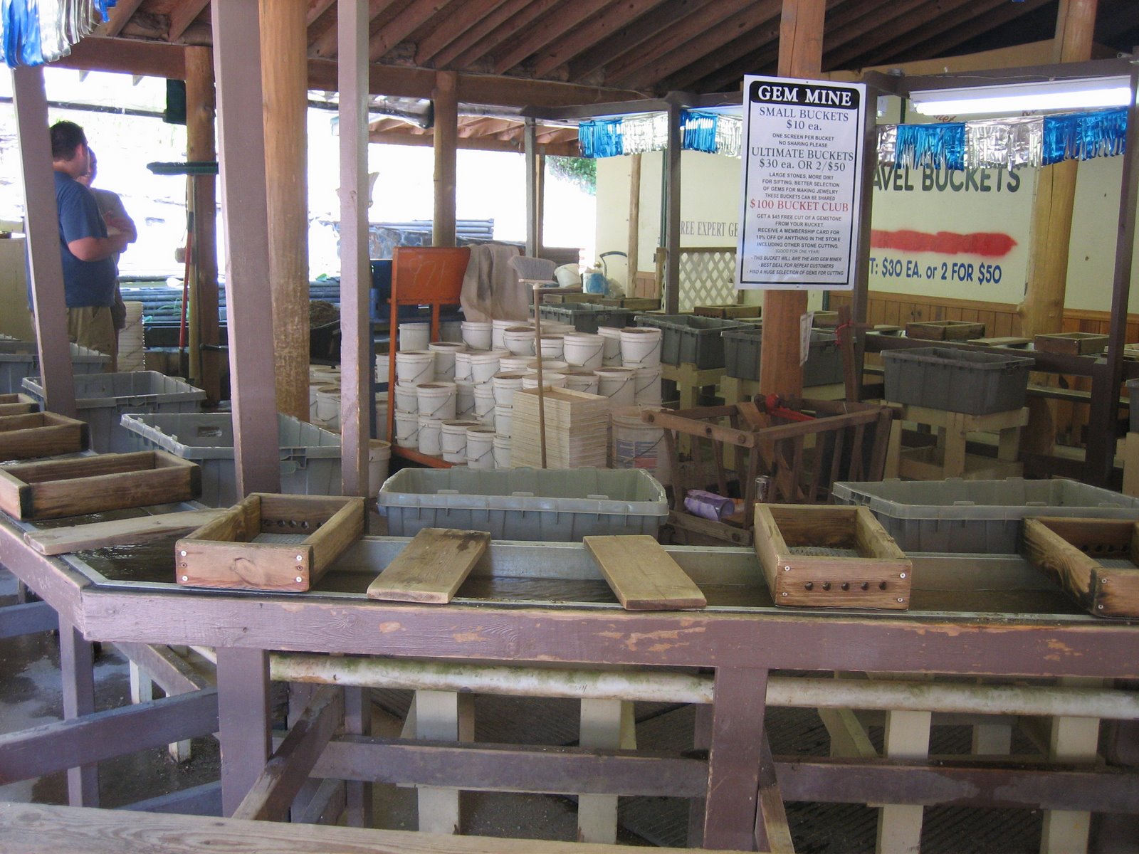 Here you can see where you actually do the gem mining. You scoop the dirt into the boxes with screen on the bottom, then lower them into the flowing water, where all the dirt/residue is washed away, leaving you with a variety of rocks. After some experience, you learn what is a gemstone worth keeping, and what is “just a rock”. Of course, folks from the mine are there to look over what you’re keeping and what you’re throwing away to make sure you’re not throwing away any treasures.