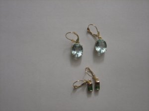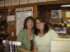 On the right is Holly, jeweler extraordinaire, and her mom, and their family owns Jackson Hole. Every year (except on years like last year, when she’s off doing something important like having a baby, so we’ll let it slide) Holly helps us decide which stones would be good to cut and helps us pick out mountings. This year, I decided that earrings were in order, so here are the sparkly, shiny things Holly made for me:The top earrings are 10.77 carats of aquamarine made out of a stone that Richard found. The bottom earrings are more difficult to see, but they’re 2.07 carats of watermelon tourmaline made of a stone I found. You can’t see the color well, but the watermelon tourmaline is a stone with both pink and green tourmaline in layers looking like a slice of watermelon when it’s cut. Very kewl! The stone was small, so I was amazed that they were able to get anything out of it, so I’m very pleased with my pretties!!!