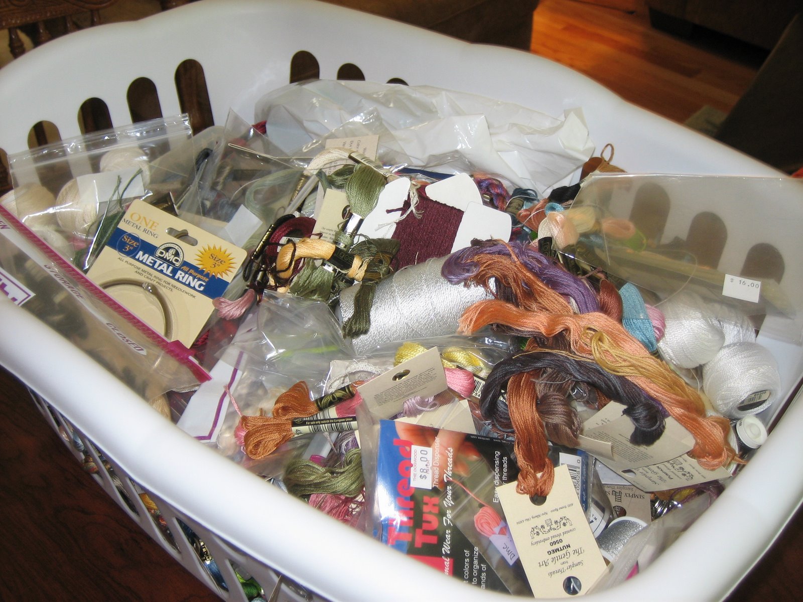 Yep. That’s a laundry basket chock full o thread. DMC, Sampler Thread, Weeks, Thread Gatherer, Waterlillies, and sundry other fibers from a variety of completed projects that were just tossed in and needed to be put in some orderly fashion where they could be found and used for other projects. While Oscar supervised (a task he does quite well), Richard and I sorted thread by maker and number and/or name, and in the case of DMC bagged it with other floss and with other types of thread put it on rings. Eventually I’ll have floss bags for everything, but I’ve got to order them.