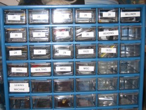 If you look carefully at the top row (please excuse the glare from the flash), you’ll notice 5 drawers full of size 28 needles. Evidently I prefer to use 28s in stitching. And, evidently I don’t need to buy any of them or any other type of needle in the near future.