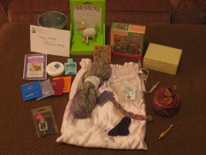 The other swap was titled “Guilty Pleasures/Good Karma”. The idea was that you swapped “luxury” items with your partner…. more expensive yarn, tools, patterns, etc. that they normally wouldn’t buy for themselves (participants filled out a questionnaire with ideas). The Good Karma part came in because to participate you had to pledge to either knit for or donate money to Warm Woolies. So while you were getting something luxurious for yourself, you helped some folks who had little to nothing, in a lot of cases, not even shoes. (Yeah, that kinda puts silly yarn purchases in perspective, doesn’t it??)