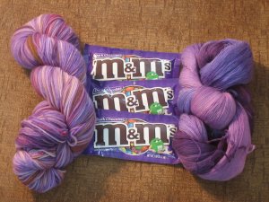 On the left is a skein of Numma Numma superwash merino sock yarn in color Grape Jam. On the right is a skein of laceweight yarn, color lilac fairy, from handpaintedyarn.com. I have had a difficult time rationing the center during tax season. 🙂 Thank you so much Jill for the lovely yarns and the yummy candy! I’m looking for the perfect sock pattern to show off the Numma Numma, and I’m not sure what I’m going to do with the laceweight yet, but laceweight is a new addition to my stash because I didn’t have any before. Good call. 🙂 I know I wasn’t the easiest person to shop for. If you travel over to Jill’s blog, you can see the package she got from her swap partner in Norway.