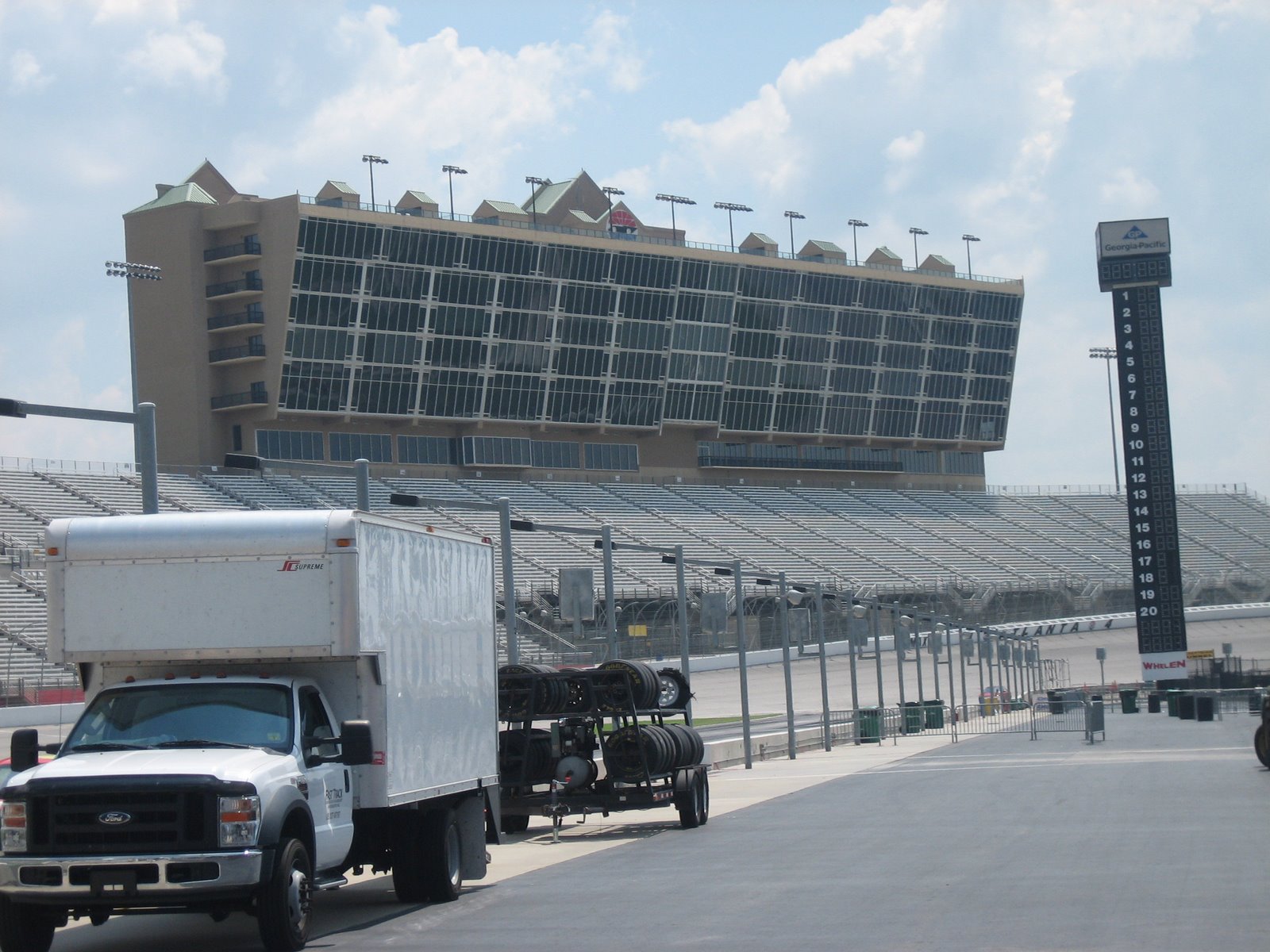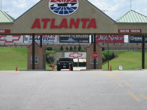 So since we weren’t going to Highlands, Richard made alternate plans for us on our Anniversary Weekend. Today we went to Atlanta Motor Speedway for a pilgrimage. This is the third track we’ve been to; the others are Bristol and Lowe’s Motor Speedway in Charlotte. While some may think it’s boring to visit the tracks when races aren’t going on, we think it’s interesting, because you can go in and really see the speedway and go places you’d never get to go if there were a race going on .As you might expect, the speedway’s a big place. Atlanta’s one of the 1.5 mile tracks, but it’s not really a “cookie cutter” because it’s one of the older tracks on the circuit (dating from 1960) and it has significant banking in the corners, making for some fast racing. As an interesting bit of trivia, in November 1992 it was the site of both Richard Petty’s last race and Jeff Gordon’s first one in the season ender.This statue of Richard Petty signing an autograph for a child is right outside the ticket office of the speedway to commemorate the event.