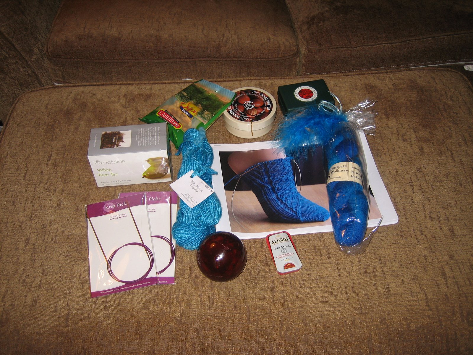 See that bright blue yarn on the right?? That’s WOLLMEISE, people!! The Holy Grail of yarn. If you’re a fan of The Maltese Falcon, it’s The Stuff Dreams Are Made Of. Seriously, I thought someone had to die and will it to you, yet Barb managed to get a skein of it for me, in a wonderful blue, and with a pattern specifically designed for it. Woot!!! The other skein of yarn is Silky Mmmmmmmalabrigo in a beautiful teal. Woot again!!!! And Knit Picks circulars to work on them with!!!