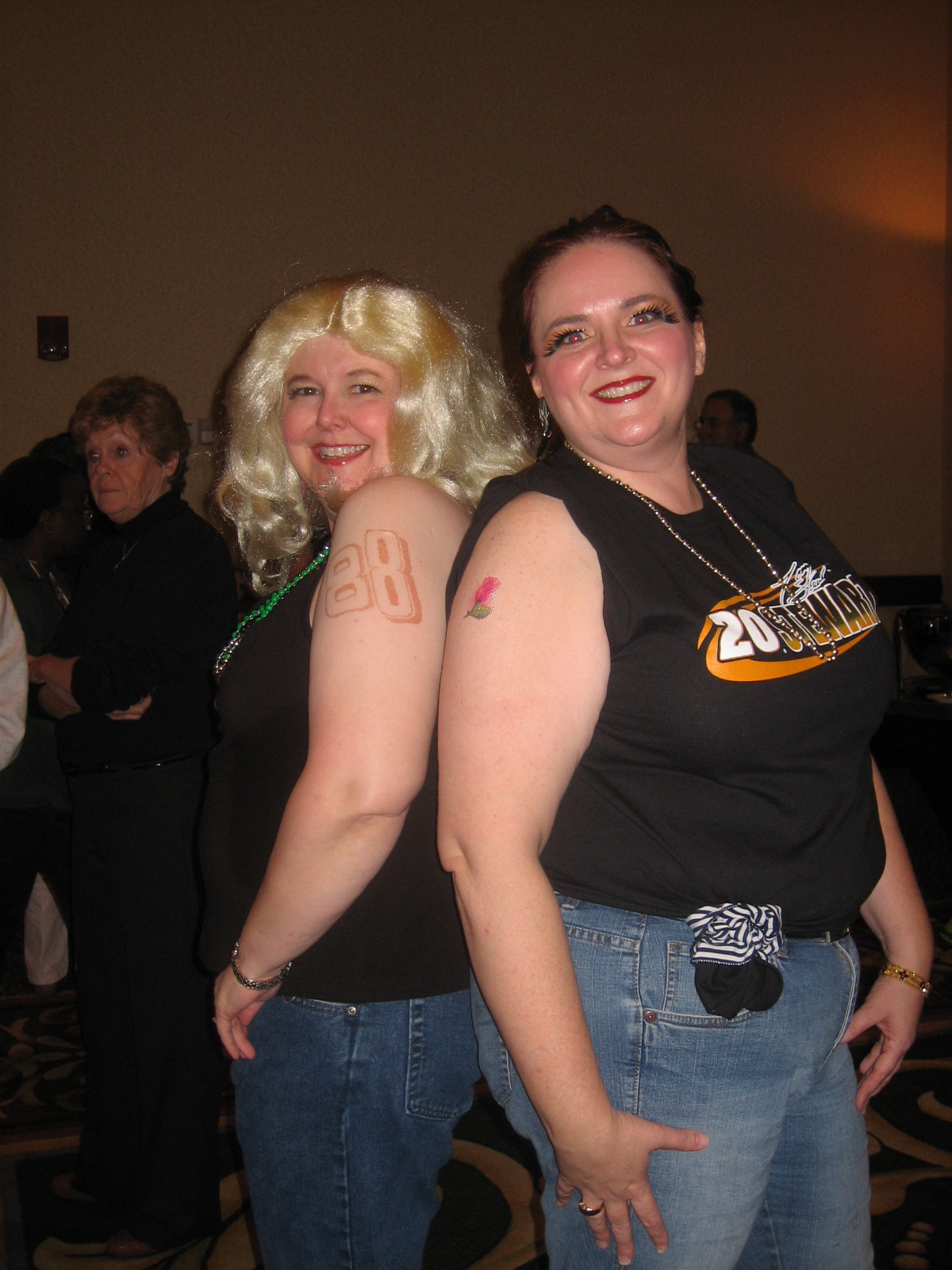 Highlight of Saturday evening had to be the costume party. Teresa and I had been planning for months to go as “pit lizards” — those ladies who stalk pit road at NASCAR races in hopes of snagging a husband/driver/baby daddy. Our costumes were well planned: