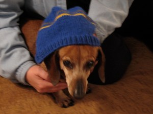 >I’ve finished a cap for Connor and his friends. Oscar was a bit of a reluctant model:I fear treats were involved after that one.