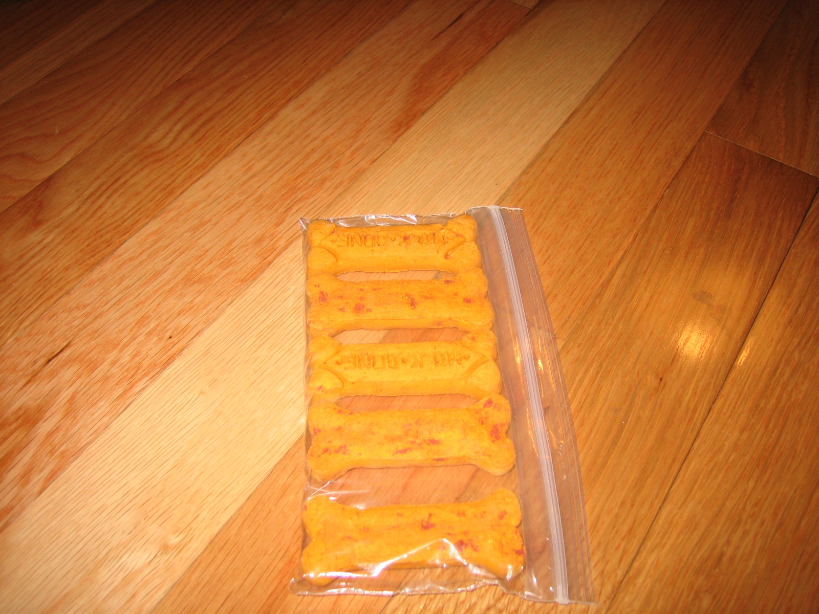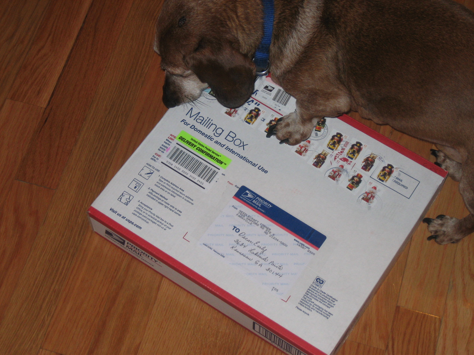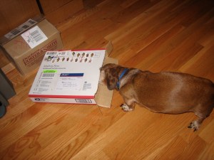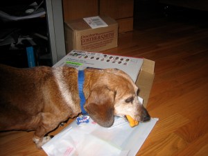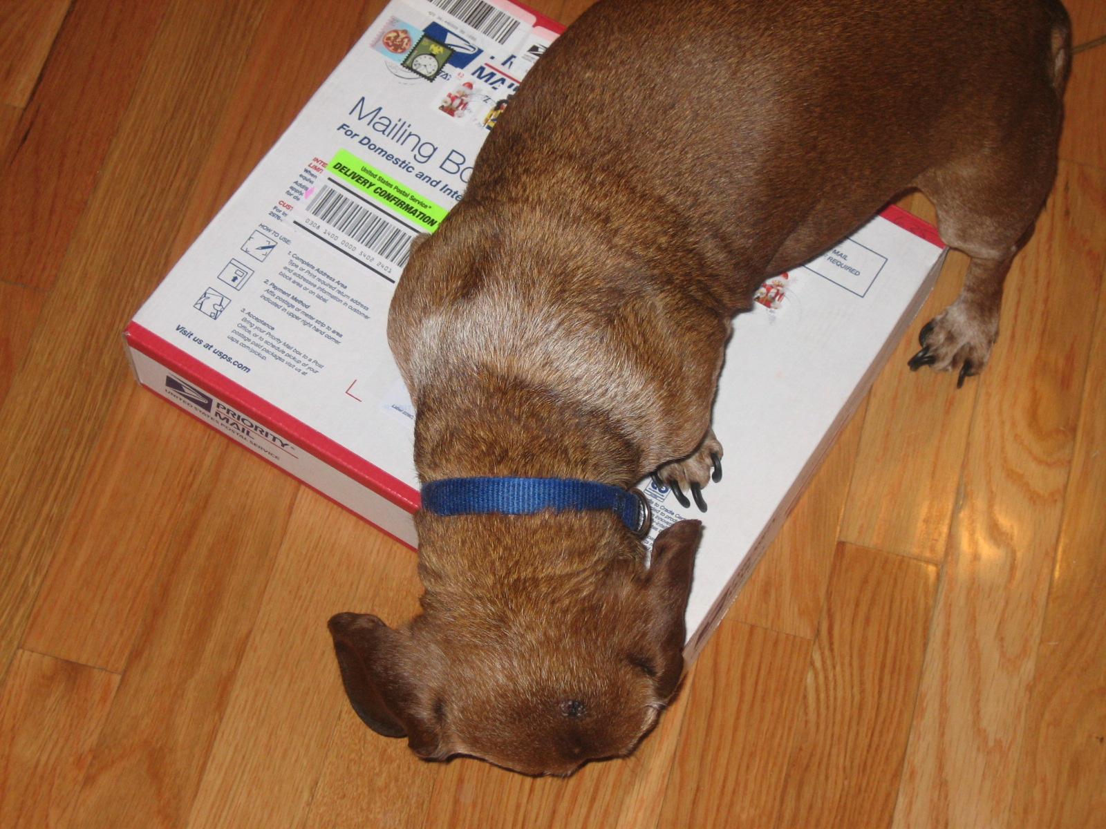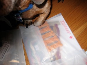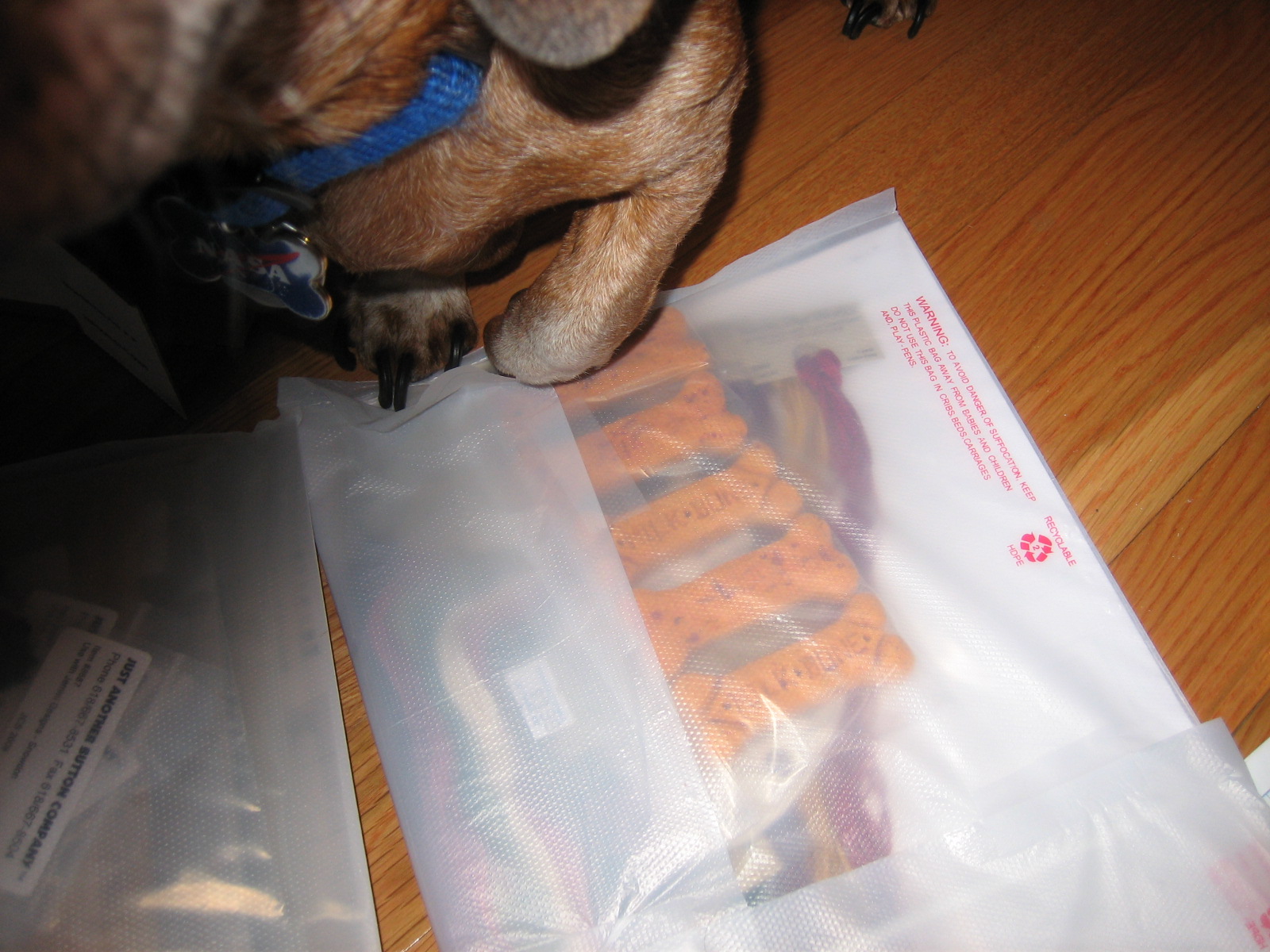 >For Me?Hmmm. Sure looks like it’s addressed to me. I don’t remember ordering anything. Mom took the credit card away after that last ugly incident with PetSmart.com…Needlecraft Corner, eh? Looks like some of Mom’s silly cross stitch stuff. Why on earth is it addressed to me? Obviously this requires some closer inspection.Now… if I can just get this stuff out of there… darn this lack of opposable thumbs! What?? Looks like cookies!!! For me!!! Finally someone’s realizing who really runs this place!Cookies! Glorious, wonderful cookies! Yummy cookies! Must get them out of the bag and have one now, now, now!!!! (Patience is not a dachshund virtue, you know.)Oh so yummy! They’re so good I had to bury some for later in my fleecy blankets on the sofa (don’t tell anyone).