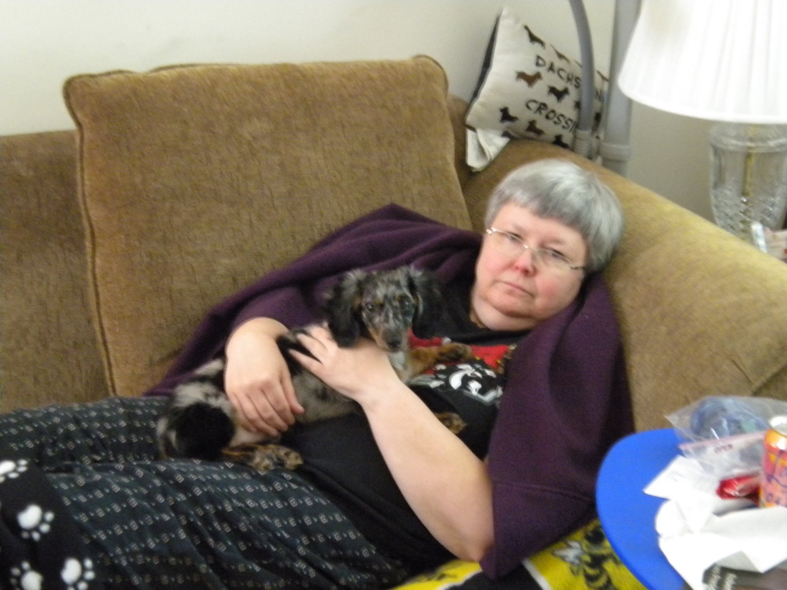 In the middle of all that, we’ve been trying to keep up with training Penny. She’ll be 17 weeks old this week, and she’s going through all the predictable puppy stuff. Teething is a big issue, as is housetraining. She’s finished her puppy shots so she’s free to mingle with other dogs. Tomorrow night she has her first session with a trainer here at the house, and then this coming Saturday she’s scheduled to start Puppy Kindergarten. Good news with her is that she’s now walking on a leash, thanks to Kim at Dr. Weaver’s office (I had a small meltdown there when we went for her last shots about all the problems we’ve been having with her. Our frustration level is high.). That means she’s been able to get outside, and she loves it. Keeping in the great dachshund tradition though, she completely ignores the geese and ducks who frequent our front yard.Here we are in a quiet moment on a Sunday afternoon. I’m in mid-summer allergy attack.