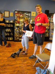 >Puppy Kindergarten, that is. 🙂Here is Penny getting her diploma from Susan of K9U. After a rigorous 7 week class, she has mastered socializing with other puppies, people, and various commands, including “come when called”, “sit”, “stay”, and the ever difficult “leave it” and “drop it”. She will also walk on a leash and seems to look forward to going out for walks and on car rides. All in all we think she did really well.