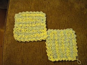 Crochet dishcloths, pattern is Tulip Stitch Dishcloth, yarn is I Love This Cotton by Hobby Lobby. You can get two cloths out of one skein. 🙂