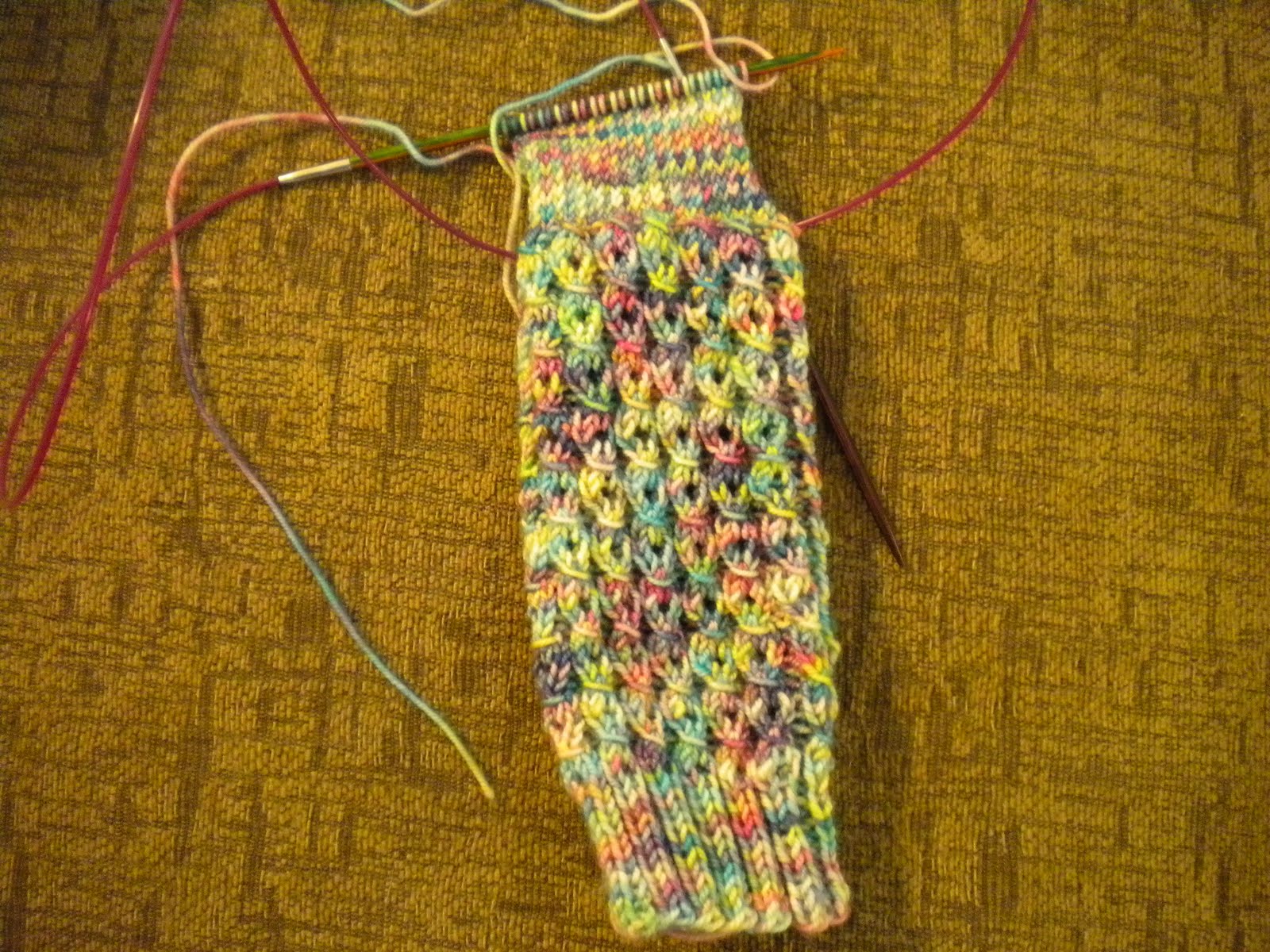 Ladder Stitch Crocheted Dishcloth, again in I Love This Cotton by Hobby Lobby. It took only part of a skein, so I’m doing another Tulip Stitch cloth out of the rest.Lacy Mock Cable socks. Yarn is an Ella Rae fingering/lace weight yarn that’s doing well for socks. 🙂
