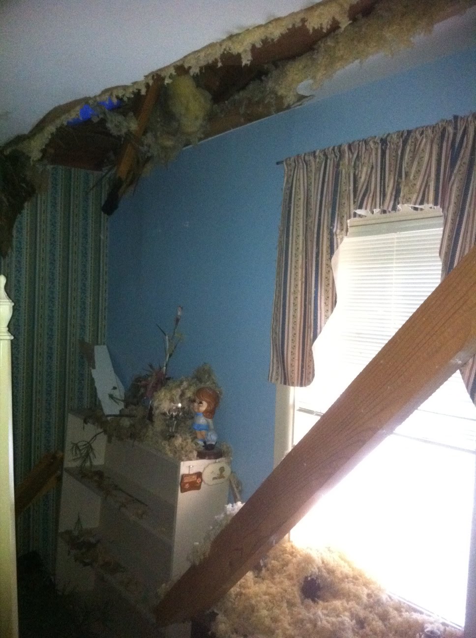 Yeah, that’s my mom’s house, and that huge green thing is a tree. It’s a tree that my Dad planted. I used to jump over it when I played as a child, and he’d get all over me for doing it. On April 15, there was a huge storm, and the tree fell onto the house. All in all we were blessed; it nipped the corner where it could easily have gone smack into the middle of the house and basically destroyed it. Instead, there was a hole in the roof, three rafters broken and lots of cosmetic interior damage to my childhood bedroom.
